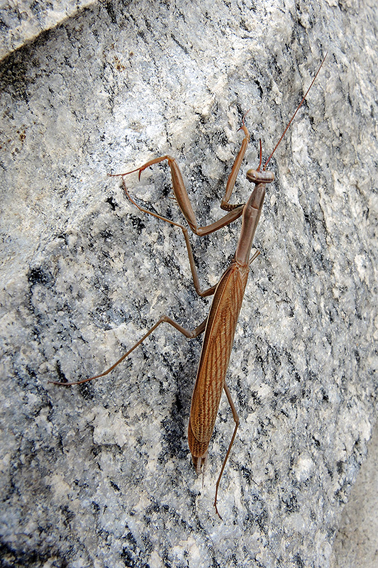 Ein für dieses jahr eher ungewöhnlich braunes Exemplar versucht sich an einer senkrechten Trockenmauer. Informationen zum Tier: Art: Europäische Gottesanbeterin (Mantis religiosa). |