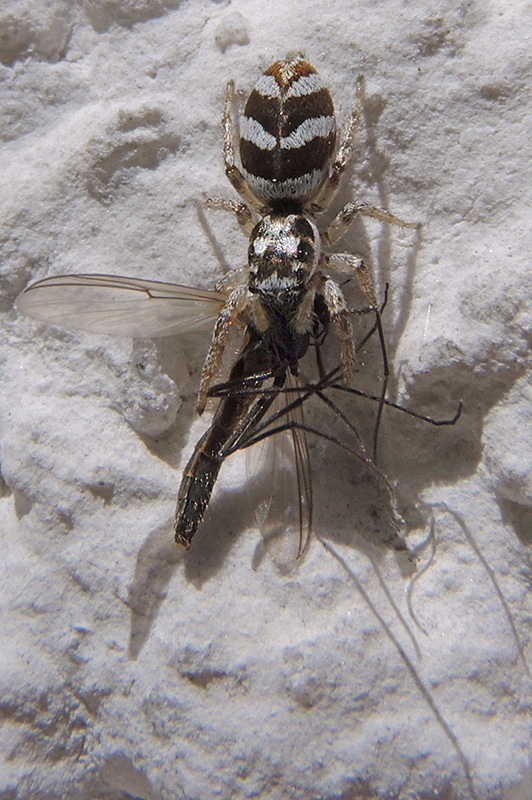 Eine Zebraspringspinne hat eine Zuckmücke (Chironomidae) erbeutet. Informationen zum Tier: Art: Zebraspringspinne (Salticus scenicus). Verbreitung: Europa, nördliches Asien und Nordamerika, häufig. Lebensräume: Das natürliche Habitat sind steinige Trockenrasen. In Nähe des Menschen sind sie oft auf Mauerwerk oder Zäunen anzutreffen. Dabei bevorzugen sie sonnenexponierte, windstille Bereiche. Merkmale: Die Tiere weisen auf dem Vorderleib (Prosoma) ein weisses Fleckenpaar und auf dem Hinterleib (Opisthosoma) drei breite, dunkle Querbänder auf. Die schwarzweisse Zeichnung wird durch hell und dunkel gefärbte Schuppenhaare hervorgerufen. Ältere Tiere sind meist dunkler gefärbt, da sich die Schuppenhaare mit der Zeit abreiben und die dunklere Grundfärbung hervortritt. Die unregelmässig gefleckten Beine sind relativ kurz, wodurch die Tiere gedrungen wirken. Männchen erreichen eine Körperlänge von 4 - 7 mm, Weibchen eine solche von 5½ - 7½ mm. Das Erkennungsmerkmal der Männchen sind die sehr langen, schräg nach vorn gerichteten Cheliceren. Ein weiteres auffälliges Merkmal sind die beiden grossen Frontaugen. Neben diesen ist ein weiteres Augenpaar nach vorn gerichtet. Vier weitere Augen befinden sich an den Seiten des Vorderleibes. Aufgrund dieser Anordnung können sie auch nach hinten sehen. Im Gegensatz zu anderen Spinnen, die auf das Ertasten von Erschütterungen oder Erkennen von Bewegungen angewiesen sind, erkennen Springspinnen auch tote Insekten als Nahrung. Lebensweise: Die tagaktiven Tiere leben meist in festen Revieren und sind ortstreu. Männchen kann man von März bis September, Weibchen von März bis Dezember antreffen. An nassen oder kühlen Tagen ziehen sie sich in ihr Gespinst zurück. Dieses dient auch der Überwinterung. Nahrung: Insekten und kleine Larven. Bei der Jagd nähert sich die Spinne langsam der Beute an. Aus einem Abstand von bis zu 5 cm springt sie dann auf das Beutetier und tötet dieses mit einem Giftbiss. Bis die Wirkung des Giftes einsetzt, hält sie die Beute mit ihren kräftigen Beinen fest. Das Gift wirkt bei Insekten sehr schnell, für den Menschen sind die Tiere hingegen absolut ungefährlich. Vor dem Sprung sichert sie sich mit einem Faden gegen einen Absturz, so dass sie nach einem missglückten Sprung wieder an den Ausgangspunkt zurückkehren kann. Zum Springen werden das dritte und das vierte Beinpaar ruckartig gestreckt. Mit den beiden ersten Beinpaaren wird das Beutetier ergriffen und die Landung gebremst. Paarung: Die Paarungszeit erstreckt sich etwa von Mai bis August. Rivalisierende Männchen liefern sich teilweise heftige Kämpfe. Die Männchen präsentieren sich dem Weibchen bei der Balz mit weit geöffneten Cheliceren. Die teilweise Stunden dauernde Paarung findet in der Gespinströhre statt. Anschliessend verlässt das Männchen die Partnerin. Es kümmert sich auch nicht um die Aufzucht. Ei: Bis über 20 Eier werden in einem kleinen Kokon abgelegt. Jungtiere: Die Jungtiere schlüpfen ab etwa Juni bis in den August. Das Weibchen ist den Jungtieren behilflich und öffnet den Kokon. In der ersten Zeit ernähren sich die Jungtiere vom Eidotter. Nach der ersten Häutung sind sie dann selbständig. Lebenserwartung: Als adultes Tier bis 15 Monate. Feinde: Singvögel, Wespen, Schlupfwespen. |