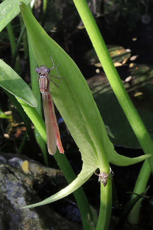Eine eben geschlüpfte Frühe Adonislibelle härtet ihre Flügel aus. Informationen zum Tier: Art: Frühe Adonislibelle (Pyrrhosoma nymphula). Verbreitung: Die Art ist in Europa weit verbreitet. In Skandinavien tritt sie nur in den südlichen Regionen sowie entlang der norwegischen Küste auf. Sie fehlt in Teilen Südeuropas und auf der Balkanhalbinsel. Die Ostgrenze der Verbreitung bildet der Kaukasus. Regionale Verbreitung Alpen: In Höhen bis gegen 2000 m. Lebensräume: Weiher, Seen, langsam fliessende Bäche, moorige Tümpel, Gräben mit dichter Ufervegetation. Merkmale: Die Körperlänge beträgt 35 - 45 mm, die Flügelspannweite 50 - 70 mm. Die Beine sind schwarz gefärbt. Bei beiden Geschlechtern befinden sich schwarze Zeichnungen am Abdomen, die sich bei den Männchen auf die hinteren Segmente beschränken. Bei den Weibchen sind die schwarzen Zeichnungen deutlich stärker ausgeprägt als bei den Männchen. Es sind 4 Variationen möglich, bis hin zur seltenen, fast komplett schwarzen Farbform. Jungtiere beiderlei Geschlechts weisen auf der Brust gelbe Streifen (sogenannte Antehumeralstreifen) auf, sie dunkeln im Alter zu Scharlachrot nach. Lebensweise: Die Frühe Adonislibelle meidet das offene Wasser. Sie fliegt nur ungern und hält sich überwiegend in der Ufervegetation auf. Nahrung: Sie ernährt sich räuberisch von anderen Insekten, die in der Regel im Flug erbeutet werden. Ei: Die Paarung erfolgt im späten Frühjahr oder im Frühsommer bei sonnigem Wetter während der frühen Morgenstunden. Zur Eiablage landen die Tiere im 'Tandem' auf schwimmenden oder aus dem Wasser ragenden Pflanzen. Das Weibchen heftet die Eier an Pflanzenteile unterhalb der Wasseroberfläche. Dazu taucht es oft nahezu vollständig im Wasser ein. Larve: Die Larven schlüpfen nach 3 - 6 Wochen. Sie leben zunächst zwischen Wasserpflanzen, später sind sie auch an sonnigen Uferstellen am Bodenschlamm niedriger Wassertiefe zu finden. Sie ernähren sich von Kleinstlebewesen. Die Überwinterung erfolgt im letzten Larvenstadium. Imago: Im Frühjahr kriechen die Larven an der Ufervegetation aus dem Wasser. Dort befreien sich die Imagines aus ihrer Hülle (Exuvie). Sie entfernen sich in den ersten 3 Wochen vom Brutgewässer, um in der Umgebung herumzustreifen. Danach kehren sie wieder ans Brutgewässer zurück. Die Flugzeit der adulten Tiere reicht von April bis August. Lebenserwartung: Männchen im Mittel um 4 Wochen (maximal 2½ Monate), Weibchen um 3 Wochen (maximal 1½ Monate). Feinde: Frösche, Vögel und Hornissen. Webspinnen und Ameisen können frisch geschlüpfte Libellen attackieren und verzehren. Larven werden von Fischen gefressen. |