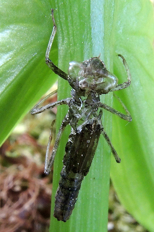Die Exuvie genannte Larvenhaut verbleibt als Zeugnis der Wandlung zum Imago. Informationen zum Tier: Art: Frühe Adonislibelle (Pyrrhosoma nymphula). Verbreitung: Die Art ist in Europa weit verbreitet. In Skandinavien tritt sie nur in den südlichen Regionen sowie entlang der norwegischen Küste auf. Sie fehlt in Teilen Südeuropas und auf der Balkanhalbinsel. Die Ostgrenze der Verbreitung bildet der Kaukasus. Regionale Verbreitung Alpen: In Höhen bis gegen 2000 m. Lebensräume: Weiher, Seen, langsam fliessende Bäche, moorige Tümpel, Gräben mit dichter Ufervegetation. Merkmale: Die Körperlänge beträgt 35 - 45 mm, die Flügelspannweite 50 - 70 mm. Die Beine sind schwarz gefärbt. Bei beiden Geschlechtern befinden sich schwarze Zeichnungen am Abdomen, die sich bei den Männchen auf die hinteren Segmente beschränken. Bei den Weibchen sind die schwarzen Zeichnungen deutlich stärker ausgeprägt als bei den Männchen. Es sind 4 Variationen möglich, bis hin zur seltenen, fast komplett schwarzen Farbform. Jungtiere beiderlei Geschlechts weisen auf der Brust gelbe Streifen (sogenannte Antehumeralstreifen) auf, sie dunkeln im Alter zu Scharlachrot nach. Lebensweise: Die Frühe Adonislibelle meidet das offene Wasser. Sie fliegt nur ungern und hält sich überwiegend in der Ufervegetation auf. Nahrung: Sie ernährt sich räuberisch von anderen Insekten, die in der Regel im Flug erbeutet werden. Ei: Die Paarung erfolgt im späten Frühjahr oder im Frühsommer bei sonnigem Wetter während der frühen Morgenstunden. Zur Eiablage landen die Tiere im 'Tandem' auf schwimmenden oder aus dem Wasser ragenden Pflanzen. Das Weibchen heftet die Eier an Pflanzenteile unterhalb der Wasseroberfläche. Dazu taucht es oft nahezu vollständig im Wasser ein. Larve: Die Larven schlüpfen nach 3 - 6 Wochen. Sie leben zunächst zwischen Wasserpflanzen, später sind sie auch an sonnigen Uferstellen am Bodenschlamm niedriger Wassertiefe zu finden. Sie ernähren sich von Kleinstlebewesen. Die Überwinterung erfolgt im letzten Larvenstadium. Imago: Im Frühjahr kriechen die Larven an der Ufervegetation aus dem Wasser. Dort befreien sich die Imagines aus ihrer Hülle (Exuvie). Sie entfernen sich in den ersten 3 Wochen vom Brutgewässer, um in der Umgebung herumzustreifen. Danach kehren sie wieder ans Brutgewässer zurück. Die Flugzeit der adulten Tiere reicht von April bis August. Lebenserwartung: Männchen im Mittel um 4 Wochen (maximal 2½ Monate), Weibchen um 3 Wochen (maximal 1½ Monate). Feinde: Frösche, Vögel und Hornissen. Webspinnen und Ameisen können frisch geschlüpfte Libellen attackieren und verzehren. Larven werden von Fischen gefressen. |