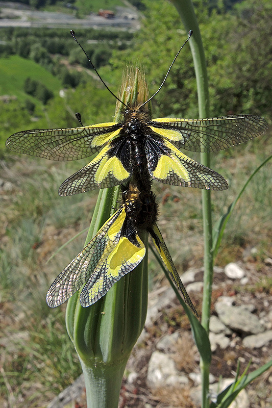 Die eigentliche Kopulation hat noch in der Luft stattgefunden, wobei das Männchen das Weibchen stets von unten her anfliegt und mit den Beinen fasst. Nach Einleitung der Kopulation lassen sie sich in der Vegetation nieder, wo sie sich dann meist innert Minutenfrist wieder voneinander lösen. Informationen zum Tier: Art: Libellen-Schmetterlingshaft (Libelloides coccajus). |