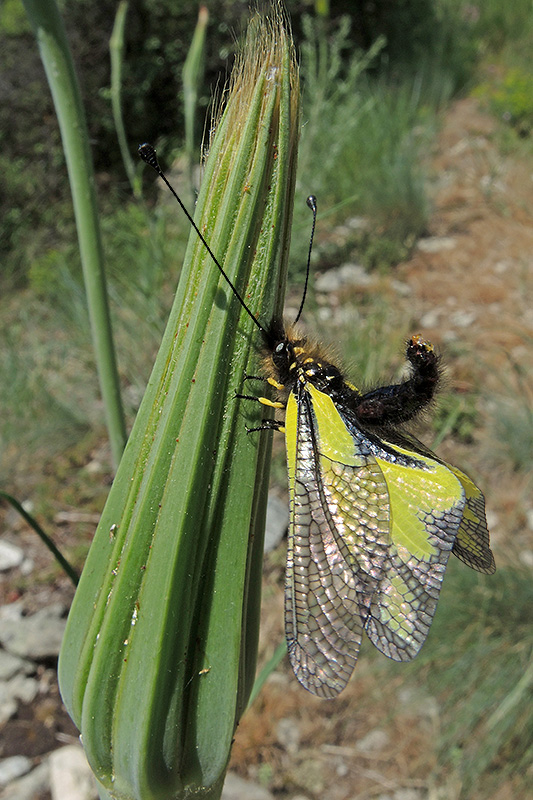Nach der Paarung hat sich das Männchen abgekoppelt und aus dem Staub gemacht. Zurück bleibt das weiterhin paarungswillige Weibchen. Informationen zum Tier: Art: Libellen-Schmetterlingshaft (Libelloides coccajus). |