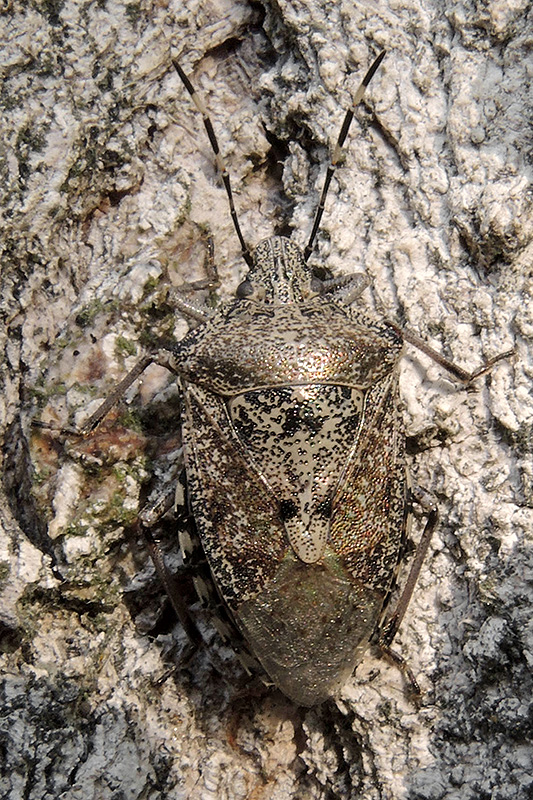 Die Graue Gartenwanze stellt keine grossen Ansprüche an ihren Lebensraum. Informationen zum Tier: Art: Graue Gartenwanze (Rhaphigaster nebulosa). Verbreitung: Paläarktisch, häufig. Lebensräume: Sie lebt phytophag auf verschiedenen Laubgehölzen und in der Krautschicht. Merkmale: Die Graue Gartenwanze erreicht eine Länge von 14 - 16 mm. Sie ist schmutzig graugelb bis braun gefärbt mit ungleichmässig verteilten Punktgruben auf der Körperoberseite. Die Membran der Vorderflügel ist häufig dunkelbraun gefleckt. Der Seitenrand des Hinterleibs (Connexivum) ist mit einem schwarzgelben Muster versehen. Die Fühler sind schwarzgelb geringelt, dabei ist das dritte und fünfte Fühlerglied hellgelb gefärbt. Auf der Unterseite befindet sich zwischen den Hüften ein langer Dorn. Die Mundteile sind als Stechrüssel ausgebildet. Zur Feindabwehr besitzen die Jungwanzen Stinkdrüsen auf dem Rücken, bei den adulten Tieren befinden sich diese an der Unterseite der Brust. Bei Bedrohung wird ein stark riechendes Sekret abgegeben. Sie ist kein guter Flieger und gibt bei ihrem schwerfälligen Flug laute Summtöne von sich. Lebensweise: Die Graue Gartenwanze ist tagaktiv und wärmeliebend. Wie alle Baumwanzen bildet sie nur eine Generation pro Jahr. Nahrung: Die Tiere ernähren sich saugend von Knospen, Blättern und Früchten verschiedener Laubgehölze. Gelegentlich saugen sie auch an toten Insekten. Paarung: Die Tiere paaren sich im April und Mai. Ei: Die Weibchen kleben im späten Frühling bis 40 Eier in Streifen oder Scheiben an Pflanzenteile. Die Eier sind anfänglich gelblich-weiss, später braun. Larven: Die schlüpfenden jungen Wanzen sind in ihrer Färbung variabel und flügellos. Erst ab dem dritten Nymphenstadium sind kurze Stummelflügel erkennbar. Imago: Die letzte Häutung zum Imago erfolgt im August oder September. Sie überwintern in geeigneten Verstecken wie Ritzen oder Spalten. Feinde: Spinnen, Vögel. |
