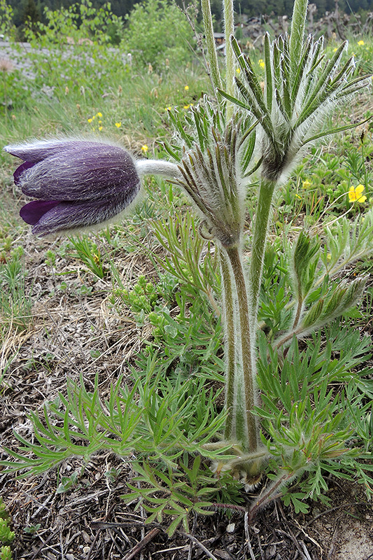 Die meisten Exemplare sind bereits verblüht, dennoch öffnen sich vereinzelne Blüten erst. Informationen zur Pflanze: Art: Berg-Anemone (Pulsatilla montana). Verbreitung: Alpen, Karpaten und Balkan. Regionale Verbreitung Alpen: Südalpen, nördlich bis zur Furche Wallis - Vorderrhein, bis in Höhen von 2000 m, selten. Vorkommen: Trockene, sommerheisse, nährstoffarme, mineralreiche, kalkhaltige Böden - Trockenrasen, lichte Trockenwälder, Gebüsche, Felsen. Wuchshöhe: 7 - 25 cm. Blüte: März - Mai, Länge Blütenhüllblätter 2 - 3 cm. |