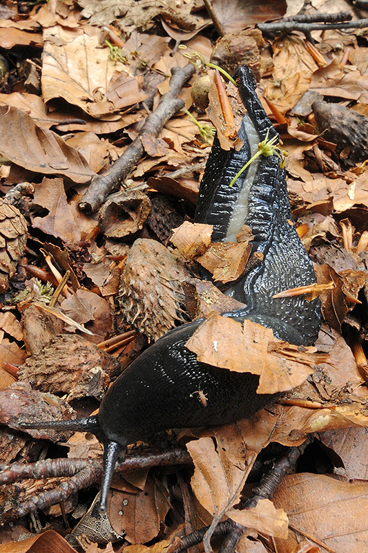 Das Tier zeigt seine intensiv gefärbte Sohle. Informationen zum Tier: Art: Schwarzer Schnegel (Limax cinereoniger). |