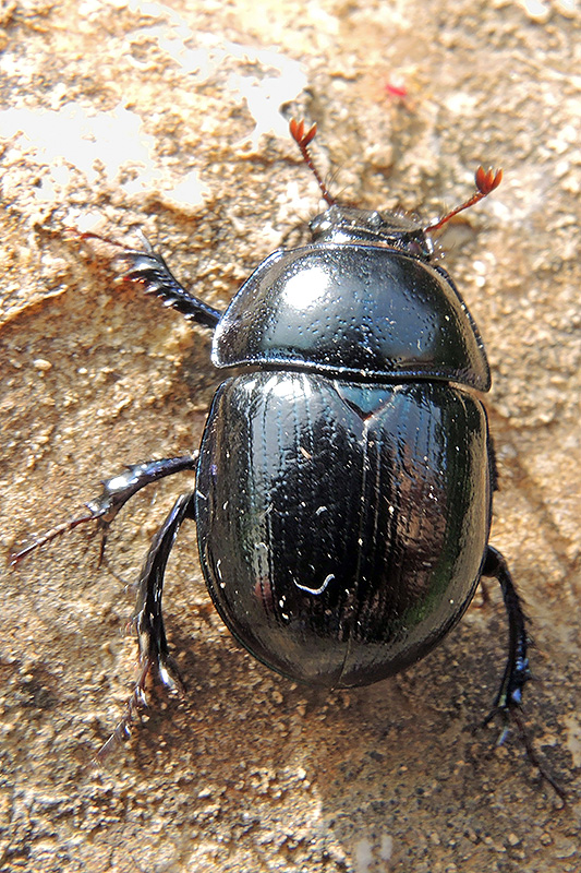 Ein Waldmistkäfer im Morgenlicht. Informationen zum Tier: Art: Waldmistkäfer (Anoplotrupes stercorosus). Verbreitung: Europa, östlich bis in den Westen Sibiriens, nördlich bis etwa zum 67. Breitengrad, häufig bis sehr häufig. Regionale Verbreitung Alpen: Vom Flachland bis in Höhen von 2000 m. Lebensräume: Vorwiegend Wälder. Merkmale: Die Käfer werden 12 - 19 mm lang. Sie sind schwarzblau, die Deckflügel sind seitlich blau, violett oder grün, das Halsschild ist bei manchen Tieren blauviolett. Die Unterseite des Körpers ist metallblau, violett oder grün, die Fühler sind rotbraun. Die Basis des Halsschildes ist vollständig gerandet und unregelmässig gepunktet. Der Endzahn der Vorderschienen ist leicht zugespitzt, der vordere Schenkel des Beines besitzt vorne keinen Tomentfleck. Die Hinterschienen sind zudem nur mit zwei Querleisten versehen. Die Deckflügel besitzen keine Naht und haben je sieben leicht gepunktete Längsrillen. Lebensweise: Waldmistkäfer sind auf der Suche nach Nahrung einzeln unterwegs. Ihr guter Geruchssinn ermöglicht ihnen, diese aus Entfernungen von bis zu 2 km aufzuspüren. Gerne halten sie sich unter frischem Dung auf. Die Tiere sind als Entsorgungsspezialisten von grosser ökologischer Bedeutung. Nahrung: Kot, Aas, auch faulende Pflanzenteile, Pilze, Obst oder Säfte. Paarung: Treffen paarungsbereite Tiere aufeinander, betrillert das Männchen das Weibchen mit den Maxillarpalpen, deren Spitzen mit Sinnesorganen besetzt sind. Gleichzeitig erzeugt es kurze Werbelaute. Das Weibchen läuft weiter, das Männchen folgt und hält Körperkontakt. Geht dieser unter Umständen verloren, erzeugen beide Tiere Suchlaute, die bis 1½ Sekunden dauern. Schliesslich beginnt das Weibchen, sich einzugraben. Während des Eingrabens gibt das Weibchen Laute ab, die Führungslaute genannt werden. Die Begattung erfolgt wahrscheinlich in den unterirdischen Gängen. Ei: Männchen und Weibchen bauen im Frühjahr einen 70 - 80 mm tiefen Stollen in den Erdboden, von dem mehrere in Kammern endende Nebengänge abzweigen. Die Weibchen besorgen die unterirdischen Arbeiten, die Männchen oberirdische wie den Abtransport der ausgeworfenen Erde. In die Kammern wird je ein Ei gelegt und Kot eingebracht, von dem sich die Larven ernähren. Larve: Sie benötigt für ihre Entwicklung ein Jahr, die Überwinterung erfolgt als Larve. Puppe: Die Verpuppung erfolgt im Frühjahr. Käfer: Die Käfer schlüpfen im Sommer, sind aber erst im nächsten Frühjahr geschlechtsreif. Lebenserwartung: Als Käfer zweijährig. Fressfeinde: Allerlei Waldbewohner wie Spitzmäuse, Igel oder Eulen. |