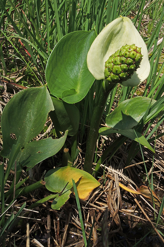 Die Blüten der Drachenwurz stehen an einem Kolben, der von einem innen weisslichen Hüllblatt umgeben wird.