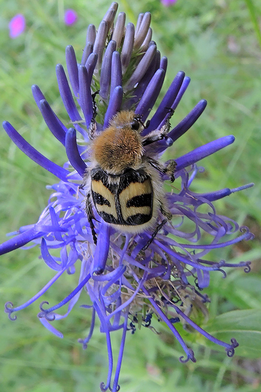 Ein Gebänderter Pinselkäfer besucht den Blütenstand einer Betonienblättrigen Rapunzel (Phyteuma betonicifolium). Informationen zum Tier: Art: Gebänderter Pinselkäfer (Trichius fasciatus). Verbreitung: Von der nördlichen Iberischen Halbinsel bis zum Nordkap, östlich bis Japan. Regionale Verbreitung Alpen: Im Bergland gebietsweise häufig, im Flachland eher selten. Lebensräume: Waldlichtungen, -wiesen und -ränder. Merkmale: Der Käfer erreicht eine Länge von 9 - 12 mm. Die schwarze Zeichnung auf den hellgelben bis tieforange gefärbten Flügeldecken kann stark variieren. Der restliche Körper ist mit gelben und weissen, wolligen Haaren besetzt. Nahrung: Pollen diverser blütentragender Pflanzen. Larve: Die Larven entwickeln sich in vermoderndem Holz verschiedener Laubbäume. Sie ernähren sich überwiegend von Totholz und anderen organischen Pflanzenteilen. Die Entwicklung zum Käfer dauert bis 2 Jahre. Puppe: Zum Puppenstadium liegen keine Erkenntnisse vor. Käfer: Die tagaktiven Käfer sind von Mai bis September meist auf Blüten anzutreffen. |