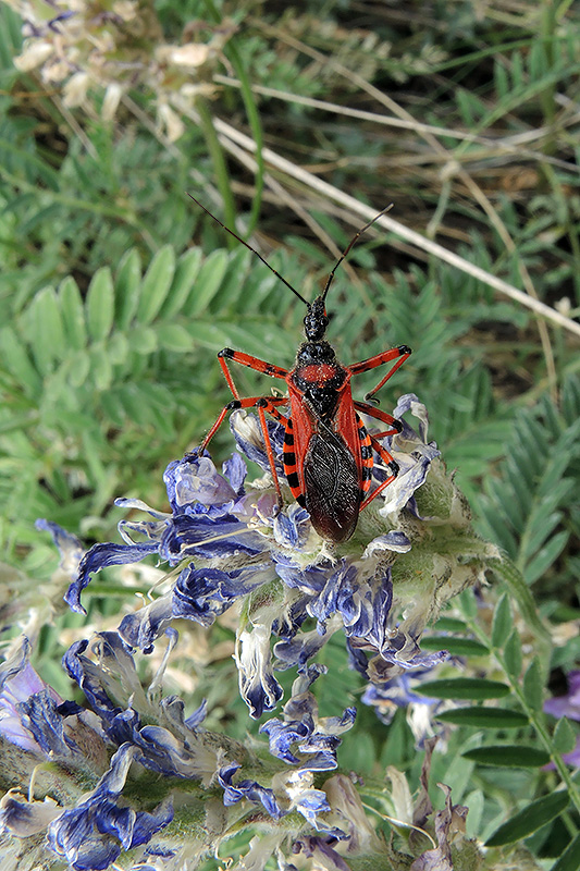 Eine Zornige Raubwanze lauert in der Vegetation. Informationen zum Tier: Art: Zornige Raubwanze (Rhynocoris iracundus). Verbreitung: Vom südlichen Mitteleuropa und dem Mittelmeerraum bis nach Kleinasien, Zentralasien und China. Sie ist südlich der Alpen recht häufig, nördlich der Alpen auf warme Gebiete beschränkt. Lebensräume: Sonnige und trocken-warme Biotope wie krautreiche Wiesen, Trockenrasen oder karge, felsige Stellen. Merkmale: Die Körperlänge beträgt zwischen 14 und 18 mm. Sie ist gross und kräftig gebaut und zeigt eine variable, schwarz-rote Musterung. Die Körperunterseite ist rot und verfügt über Reihen schwarzer Flecke. Das Schildchen (Scutellum) ist schwarz mit roter Spitze. Der Halsschild (Pronotum) ist rot mit schwarzer Zeichnung oder schwarz mit roter Mitte. Das Corium und der Cuneus der Vorderflügel (Hemielytren) sind rot, der Clavus und die Membran sind schwarz, ebenso die geknieten Fühler. Der kräftige Stechrüssel (Rostrum) ist dreigliedrig. Lebensweise: Erwachsene Tiere sind überwiegend in der Krautschicht auf den Blüten von Doldenblütlern (Apiaceae) anzutreffen. Sie sind immer langflügelig (makropter) und gute Flieger. Bei Störungen streifen sie den Rüssel über eine zwischen den Vorderhüften befindliche quergeriefte Rinne, wodurch zirpende Laute erzeugt werden. Nahrung: Die Tiere ernähren sich ausschliesslich räuberisch von verschiedenen Insekten, die oft grösser sind als sie selbst. Die Beute wird durch einen auch für den Menschen schmerzhaften Stich rasch abgetötet und ausgesaugt. Ei: Die schwärzlichen Eigelege werden in der Vegetation abgelegt. Larven: Die Larven halten sich fast ausschliesslich am Boden auf und sind unter Steinen, Totholz, in Pflanzenpolstern oder in der lockeren Streu zu finden. Es werden mehrere Larvenstadien durchlaufen. Die Larven überwintern. Imago: Die Imagines treten in einer Generation pro Jahr etwa von Mai bis September auf. Feinde: Spinnen, Vögel. |