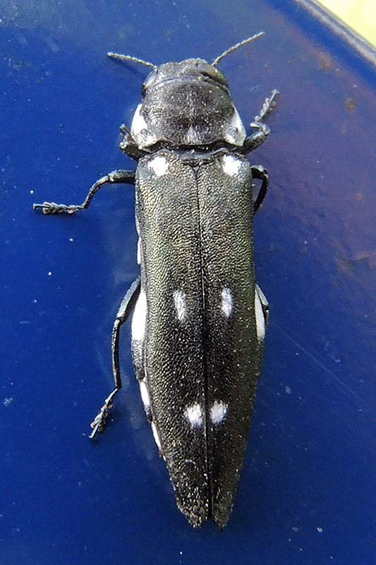 Der ruppige Wind hat einen Gefleckten Pappel-Prachtkäfer aus einem nahen Baum auf die Lehne eines Campingstuhls verfrachtet. Informationen zum Tier: Art: Gefleckter Pappel-Prachtkäfer (Agrilus ater). Verbreitung: Ganz Europa mit Ausnahme des Nordwestens. Lebensräume: Die Käfer leben an Weiden und Pappeln. Merkmale: Der Käfer wird zwischen 6 und 11 mm lang. Der Kopf ist kurz und von oben gesehen über doppelt so breit wie lang. Die Oberlippe ist rechteckig. Die Oberkiefer sind stark, gebogen, zugespitzt, auf der inneren Seite ausgeschnitten, mit einem stumpfen Zahn. Der Kiefertaster ist viergliedrig, das erste Glied ist sehr klein, das zweite lang und das letzte verdickt. Das Lippentasterendglied ist gross und keulenförmig. Die elfgliedrigen Fühler sind kurz, ab dem vierten Glied nach innen gesägt und etwa auf der Höhe des Unterrandes der Augen eingelenkt. Die Augen bedecken beinahe die ganze Seite des Kopfes, ihr Hinterrand verläuft parallel und in kleinem Abstand zum seitlichen Vorderrand des Halsschildes. Die vertikale Ausdehnung ist viel grösser als die horizontale. Der Halsschild ist viel breiter als lang und an den Seiten leicht gerundet. Er trägt einen doppelten Seitenrand. Der Abstand zwischen dem eigentlichen Seitenrand und der darunter verlaufenden kielartigen Erhöhung ist nahe der Basis des Halsschildes sehr klein und vergrössert sich nach vorne. Über dem Seitenrand an den Hinterwinkeln des Halsschildes befindet sich eine kielartige Erhöhung. Vor jeder Flügeldecke ist der Halsschild tief ausgerandet, vor dem Schildchen seicht. Das Schildchen ist dreieckig, hinten spitz zulaufend und hat einen deutlichen Querkiel. Die Vorderbrust ist nach vorn leicht aufgebogen und gerandet, der Vorderrand ist nur leicht ausgerandet. Die Verlängerung der Vorderbrust nach hinten (Prosternalfortsatz) verjüngt sich nach hinten spitzwinklig. Dabei überdeckt sie die Mittelbrust, sodass diese scheinbar geteilt ist. Die Tarsen der Beine sind alle fünfgliedrig, die vier ersten Tarsenglieder sind gelappt. Das erste Glied der Hintertarsen ist länger als die folgenden drei zusammen. Die Krallen besitzen an der Basis je einen Zahn, der beim Weibchen stumpf und breit, beim Männchen lang und spitz ist, wodurch die Klauen gespalten wirken. Die Hinterhüften sind aussen stark erweitert. Die ersten zwei der fünf sichtbaren Bauchringe (Sternite) sind miteinander verwachsen. Etwa auf der Höhe der Verwachsung ist der Hinterleib am breitesten, danach verjüngt er sich gleichförmig. Das fünfte Sternit ist hinten abgerundet. Die Flügeldecken sind schmal und lassen seitlich einen Teil des Hinterleibs unbedeckt. Vorne sind sie wenig breiter als der Halsschild, danach nur leicht nach innen ausgerandet. Im letzten Drittel verschmälern sie sich gleichmässig. Ihr Hinterende ist gezähnt und jeweils in eine Spitze ausgezogen. Innen neben der Schulterbeule sind die Flügeldecken eingedrückt. Im hinteren Drittel besitzen sie nahe der Naht, an der die Flügeldecken aneinander stossen, einen länglichen Fleck aus weissen Haaren. Ein zweites Paar weisser länglicher Flecke befindet sich weiter voneinander entfernt etwa auf der Höhe der Mitte der Flügeldecken. Ein dritter Fleck unbestimmter Form befindet sich in den Eindrücken an der Flügelbasis. Helle Haarflecken finden sich ausserdem an der Aussenseite der Hinterhüfte, aussen am dritten bis fünften Sternit und auf den Seiten der Hinterleibsabschnitte (Pleurite), ausser am zweiten und meistens am fünften. Ei: Zum Eistadium sind keine Informationen verfügbar. Larve: Sie entwickeln sich im Holz von Weiden und Pappeln. Puppe: Zum Puppenstadium sind keine Informationen verfügbar. Käfer: Adulte Tiere sind in Mitteleuropa im Juni und Juli zu finden. |