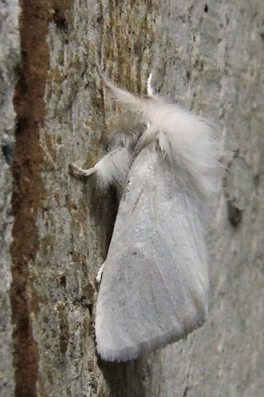 Ein Weibchen des Dunklen Goldafters sitzt an einer beleuchteten Mauer. Informationen zum Tier: Art: Dunkler Goldafter (Euproctis chrysorrhoea). |