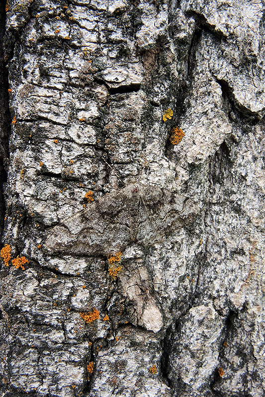 Der Falter hebt sich kaum vom Stamm der Pappel ab. Informationen zum Tier: Art: Wellenlinien-Rindenspanner (Alcis repandata). Verbreitung: Ganz Europa bis zum Ural, im Süden über den Mittelmeerraum, Kleinasien, den Kaukasus bis Kasachstan, im Norden bis zum Polarkreis. Regionale Verbreitung Alpen: Bis in Höhen von 1800 m. Lebensräume: Laub-, Misch- und Nadelwälder, buschige Heiden, Wiesen, Moorgebiete, Siedlungsbereiche. Merkmale: Die Flügelspannweite schwankt stark und kann zwischen 38 und 55 mm betragen. Die Falter zeichnen sich durch eine hohe farbliche Variabilität aus. Auf den Vorderflügeln dominieren weissliche, graue und bräunliche Tönungen. Während die innere Querlinie glatt gebogen ist, zeigt die äussere zwei nach aussen gerichtete Vorsprünge. Im Saumfeld ist eine deutliche weisse Wellenlinie zu erkennen, die sich auf den Hinterflügeln fortsetzt. Die Fühler der Männchen sind beidseitig gekämmt, diejenigen der Weibchen fadenförmig. Ei: Die länglichen Eier sind von grüner Farbe. Raupe: Erwachsene Raupen haben eine zylindrische Form, sind an den Seiten gerunzelt, meist graubraun gefärbt und zeigen eine dunkle Fleckung oder Marmorierung. Sie leben ab dem Spätsommer polyphag an einer Vielzahl von Gehölzen und niedrigen Pflanzen. Die Raupen überwintern und sind im Zeitraum April bis Mai ausgewachsen. Puppe: Die Verpuppung erfolgt in der Erde. Die sehr schlanke Puppe ist glänzend rotbraun gefärbt und besitzt eine gespaltene Spitze am Kremaster. Falter: Die Falter sind überwiegend nachtaktiv und fliegen gern künstliche Lichtquellen, aber auch Blüten von Pfeifengräsern (Molinia), Greiskräutern (Senecio) oder Schlangen-Knöterich (Polygonum bistorta) an. Die Hauptflugzeit liegt in den Monaten Mai bis August. |