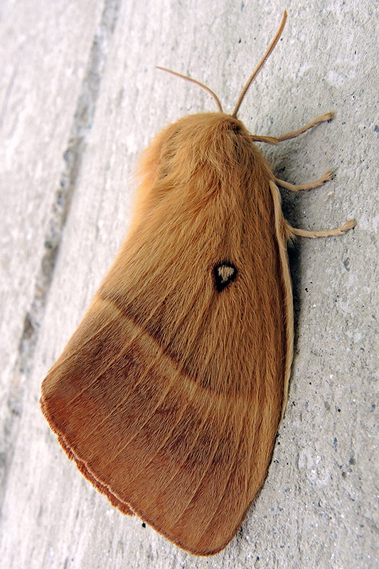 Ein weiblicher Eichenspinner ruht an einer Mauer. Informationen zum Tier: Art: Eichenspinner (Lasiocampa quercus). Verbreitung: Europa mit Ausnahme des hohen Nordens und Teilen des Mittelmeergebietes, östlich bis zum Altai. In Mitteleuropa stellenweise häufig, strichweise aber auch fehlend. Regionale Verbreitung Alpen: Bis in Höhen von über 2000 m, nahe der Baumgrenze häufig. Lebensräume: Lockere Wälder, Moorgebiete. Merkmale: Die Falter erreichen eine Flügelspannweite von 45 - 75 mm. Beide sich deutlich voneinander unterscheidenden Geschlechter (Sexualdimorphismus) haben sehr variabel gefärbte Flügel. Die Vorderflügel der Männchen haben meist eine kastanienbraune Grundfärbung und etwa zwischen den hinteren beiden Flügeldritteln eine breite, zur Flügelspitze nicht scharf begrenzte, gelb gefärbte, leicht geschwungene Binde. Daneben ist ein weisser, dunkel gerandeter Diskoidalfleck auffällig. Die Hinterflügel sind gleich gefärbt, haben aber keine Diskoidalflecken. Die Weibchen sind deutlich heller gefärbt und auch wesentlich grösser als die Männchen. Sie haben ockergelbe oder hellbraune Flügel, auf denen die gelbe Binde nur undeutlich erkennbar ist. Auf den Vorderflügeln haben sie ebenfalls weisse, dunkel gerandete Diskoidalflecken. Ei: Die Weibchen lassen die Eier im Flug auf die Vegetation fallen. Diese sind länglich rund und von ockergelber oder brauner Farbe. Raupe: Die Raupen werden etwa 80 mm lang. Sie sind dicht behaart und besitzen Brennhaare, die ein Nesselgift enthalten. Sie haben eine schwarze Grundfärbung, wobei der Rücken junger Raupen auf jedem Segment eine gelbe Raute trägt, die in der Mitte nach hinten verlaufend einen weissen Fleck besitzt. Ältere Tiere sind bräunlich-grau gefärbt und haben an den Seiten ein Rautenmuster. Diese Rauten sind auf der einen Seite hell, an der anderen Seite braun gefärbt. Die Raupen haben zusätzlich dichte, graubraune Haarpolster am Rücken. Zwischen den Segmenten befinden sich kahle, schwarze Streifen. Die Raupen findet man ab August bis in den Mai des nächsten Jahres, sie überwintern somit. Sie ernähren sich von verschiedenen Sträuchern wie Schlehdorn (Prunus spinosa), Brombeere (Rubus fruticosus), Besenginster (Cytisus scoparius), Blaubeere (Vaccinium myrtillus), Rauschbeere (Vaccinium uliginosum), Weide (Salix spec.) oder Besenheide (Calluna vulgaris). Puppe: Die Verpuppung erfolgt im Zeitraum Ende Mai bis Anfang Juni in einem pergamentartigen, festen, ovalen Kokon am Boden. Die Puppe ist gedrungen, dick und schwarzbraun. Die Puppenruhe dauert einige Wochen. Im Gebirge oder in Hochmooren kann es auch zu einer oder zwei Überwinterungen kommen. Falter: Die Falter fliegen je nach Höhenlage von Ende Mai bis in den August. Die Männchen fliegen tagsüber auf der Suche nach Weibchen wild umher. Diese wiederum sind in der Regel nachtaktiv, nur in höheren Lagen fliegen sie auch am Tag. |