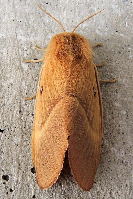 Der Falter von oben betrachtet. Informationen zum Tier: Art: Eichenspinner (Lasiocampa quercus). Verbreitung: Europa mit Ausnahme des hohen Nordens und Teilen des Mittelmeergebietes, östlich bis zum Altai. In Mitteleuropa stellenweise häufig, strichweise aber auch fehlend. Regionale Verbreitung Alpen: Bis in Höhen von über 2000 m, nahe der Baumgrenze häufig. Lebensräume: Lockere Wälder, Moorgebiete. Merkmale: Die Falter erreichen eine Flügelspannweite von 45 - 75 mm. Beide sich deutlich voneinander unterscheidenden Geschlechter (Sexualdimorphismus) haben sehr variabel gefärbte Flügel. Die Vorderflügel der Männchen haben meist eine kastanienbraune Grundfärbung und etwa zwischen den hinteren beiden Flügeldritteln eine breite, zur Flügelspitze nicht scharf begrenzte, gelb gefärbte, leicht geschwungene Binde. Daneben ist ein weisser, dunkel gerandeter Diskoidalfleck auffällig. Die Hinterflügel sind gleich gefärbt, haben aber keine Diskoidalflecken. Die Weibchen sind deutlich heller gefärbt und auch wesentlich grösser als die Männchen. Sie haben ockergelbe oder hellbraune Flügel, auf denen die gelbe Binde nur undeutlich erkennbar ist. Auf den Vorderflügeln haben sie ebenfalls weisse, dunkel gerandete Diskoidalflecken. Ei: Die Weibchen lassen die Eier im Flug auf die Vegetation fallen. Diese sind länglich rund und von ockergelber oder brauner Farbe. Raupe: Die Raupen werden etwa 80 mm lang. Sie sind dicht behaart und besitzen Brennhaare, die ein Nesselgift enthalten. Sie haben eine schwarze Grundfärbung, wobei der Rücken junger Raupen auf jedem Segment eine gelbe Raute trägt, die in der Mitte nach hinten verlaufend einen weissen Fleck besitzt. Ältere Tiere sind bräunlich-grau gefärbt und haben an den Seiten ein Rautenmuster. Diese Rauten sind auf der einen Seite hell, an der anderen Seite braun gefärbt. Die Raupen haben zusätzlich dichte, graubraune Haarpolster am Rücken. Zwischen den Segmenten befinden sich kahle, schwarze Streifen. Die Raupen findet man ab August bis in den Mai des nächsten Jahres, sie überwintern somit. Sie ernähren sich von verschiedenen Sträuchern wie Schlehdorn (Prunus spinosa), Brombeere (Rubus fruticosus), Besenginster (Cytisus scoparius), Blaubeere (Vaccinium myrtillus), Rauschbeere (Vaccinium uliginosum), Weide (Salix spec.) oder Besenheide (Calluna vulgaris). Puppe: Die Verpuppung erfolgt im Zeitraum Ende Mai bis Anfang Juni in einem pergamentartigen, festen, ovalen Kokon am Boden. Die Puppe ist gedrungen, dick und schwarzbraun. Die Puppenruhe dauert einige Wochen. Im Gebirge oder in Hochmooren kann es auch zu einer oder zwei Überwinterungen kommen. Falter: Die Falter fliegen je nach Höhenlage von Ende Mai bis in den August. Die Männchen fliegen tagsüber auf der Suche nach Weibchen wild umher. Diese wiederum sind in der Regel nachtaktiv, nur in höheren Lagen fliegen sie auch am Tag. |