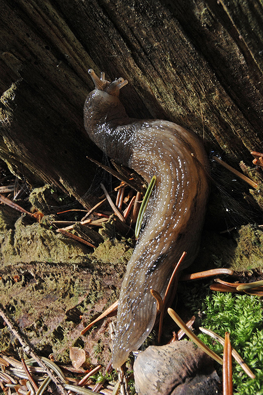Unter einem Totholzstrunk ruhend finde ich ein ziemlich irritierendes Exemplar einer Nacktschnecke. Auf Grund seines Erscheinungsbildes taxiere ich es auf den ersten Blick als noch nicht vollständig ausgewachsenen Schwarzen Schnegel (Limax cinereoniger). Dafür fehlt ihm aber die farbliche Dreiteilung der Sohle ... Für einen allenfalls auch in Frage kommenden Baumschnegel (Lehmannia marginata) wiederum stimmen Kopf und Schild nicht wirklich, ausserdem ist das Tier dafür zu gross. Erst eine Detailvergrösserung der Sohle bringt dann in Zusammenspiel mit agressiv gehandhabter Bildbearbeitung einen Hauch von farblicher Dreiteilung zum Vorschein, was definitiv hin zum Schwarzen Schnegel führt. Informationen zum Tier: Art: Schwarzer Schnegel (Limax cinereoniger). |