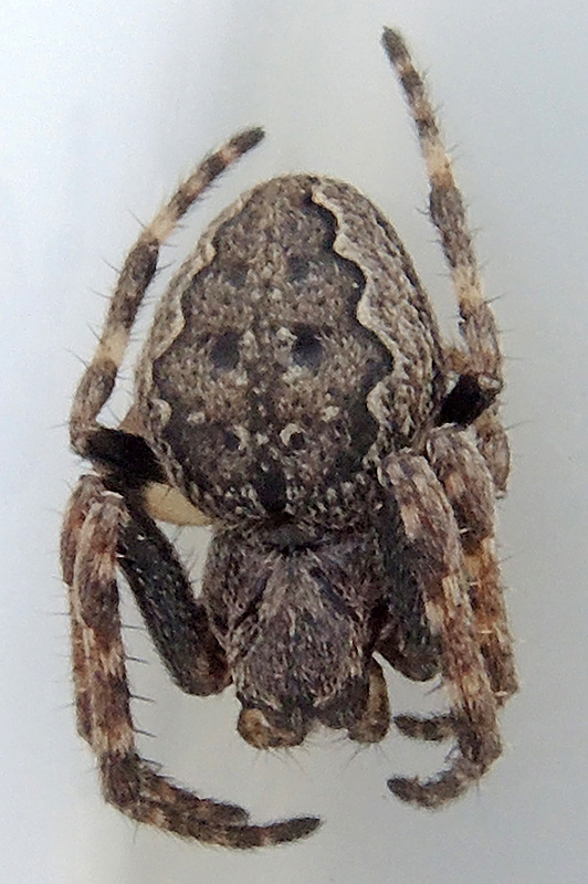 Ein Weibchen der Spaltenkreuzspinne in der Detailansicht. Informationen zum Tier: Art: Spaltenkreuzspinne (Nuctenea umbratica). Verbreitung: Die Verbreitung ist weitgehend auf die westliche Paläarktis beschränkt. Sie umfasst ganz Europa und das westliche Asien bis Aserbaidschan sowie Nordafrika. Weitere isolierte Vorkommen existieren in Zentral- und Südostasien. Die Art kommt in geeigneten Habitaten häufig vor. Lebensräume: Lichte Laub- und Mischwälder, bis in Höhen von etwa 1000 m. Merkmale: Männchen weisen eine Körperlänge von 7 - 10 mm auf, Weibchen sind 13 - 16 mm lang. Der stark behaarte Vorderkörper (Prosoma) ist dunkelbraun und im vorderen Teil rötlich braun aufgehellt. Der Hinterkörper (Opisthosoma) ist dorsoventral stark abgeflacht. Auf der Oberseite sind relativ sehr grosse, paarige Vertiefungen erkennbar, an denen im Körperinneren Muskeln ansetzen, mit denen die Spinne den Hinterkörper noch weiter abflachen kann. Die Grundfärbung variiert von rotbraun bis schwarzbraun mit einer dunklen, gelblich bis gelbgrünlich eingefassten, blattförmigen Zeichnung. Die Schenkel sind fast einfarbig dunkelbraun, die äusseren Beinglieder sind deutlich hellbraun und dunkelbraun geringelt. Die Spinne vermag Menschen zu beissen. Der Biss ist jedoch nicht sehr schmerzhaft, die Schmerzen lassen innert weniger Minuten völlig nach. Lebensweise: Das Radnetz wird in mittlerer Höhe vor allem an alte Bäume gebaut, aber auch an Holzschuppen und Hauswände. Es ist mit 45 - 70 cm Durchmesser recht gross. Auch die Radienabstände sind relativ gross. Die Nabe ist exzentrisch und meist deutlich Richtung Versteck der Spinne verschoben. Tagsüber versteckt sie sich unter loser Baumrinde oder in Rindenspalten, an Gebäuden auch in Mauerritzen. Nach Einbruch der Dunkelheit sitzt sie im Zentrum des Netzes. Bei Bedrohung lässt sie sich fallen, presst die Beine an den Leib und stellt sich tot. Nahrung: Insekten. Paarung: Hierzu liegen keine Fakten vor. Ei: Hierzu liegen keine Fakten vor. Jungtiere: Hierzu liegen keine Fakten vor. Lebenserwartung: Die Tiere weisen einen zweijährigen Entwicklungszyklus auf. Adulte Exemplare finden sich von Juni bis Oktober. Mindestens die Weibchen überwintern unter Baumrinde und ähnlichen Strukturen. Feinde: Wespen, Schlupfwespen, andere Spinnen, Fadenwürmer, Milben, Kröten, Eidechsen, Skorpione, Fledermäuse, Mäuse, Vögel. Besten Dank an CSCF/karch für die definitive Bestimmung der Art auf Grundlage der zur Verfügung gestellten Aufnahmen und Angaben. |
