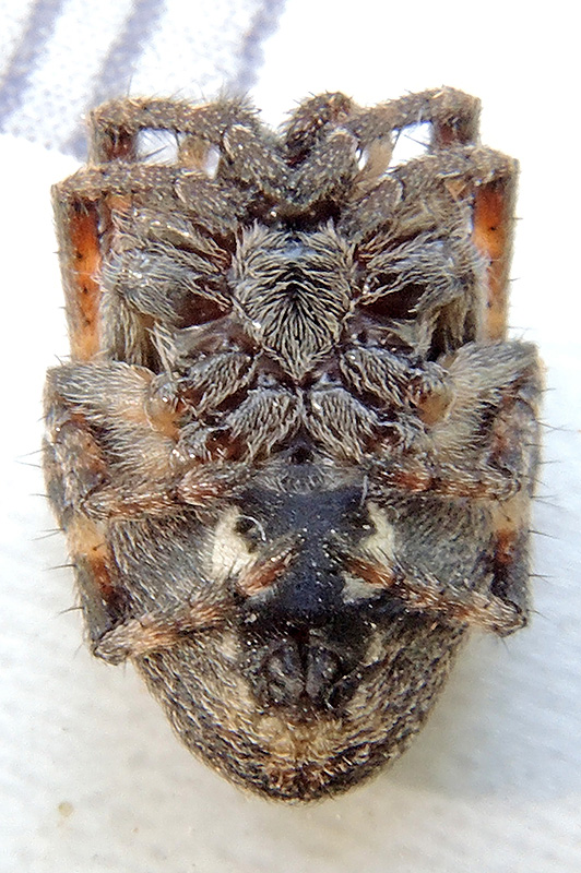Fühlt sich das Tier bedroht, lässt es sich fallen, presst die Beine an den Leib und stellt sich tot. Informationen zum Tier: Art: Spaltenkreuzspinne (Nuctenea umbratica). Verbreitung: Die Verbreitung ist weitgehend auf die westliche Paläarktis beschränkt. Sie umfasst ganz Europa und das westliche Asien bis Aserbaidschan sowie Nordafrika. Weitere isolierte Vorkommen existieren in Zentral- und Südostasien. Die Art kommt in geeigneten Habitaten häufig vor. Lebensräume: Lichte Laub- und Mischwälder, bis in Höhen von etwa 1000 m. Merkmale: Männchen weisen eine Körperlänge von 7 - 10 mm auf, Weibchen sind 13 - 16 mm lang. Der stark behaarte Vorderkörper (Prosoma) ist dunkelbraun und im vorderen Teil rötlich braun aufgehellt. Der Hinterkörper (Opisthosoma) ist dorsoventral stark abgeflacht. Auf der Oberseite sind relativ sehr grosse, paarige Vertiefungen erkennbar, an denen im Körperinneren Muskeln ansetzen, mit denen die Spinne den Hinterkörper noch weiter abflachen kann. Die Grundfärbung variiert von rotbraun bis schwarzbraun mit einer dunklen, gelblich bis gelbgrünlich eingefassten, blattförmigen Zeichnung. Die Schenkel sind fast einfarbig dunkelbraun, die äusseren Beinglieder sind deutlich hellbraun und dunkelbraun geringelt. Die Spinne vermag Menschen zu beissen. Der Biss ist jedoch nicht sehr schmerzhaft, die Schmerzen lassen innert weniger Minuten völlig nach. Lebensweise: Das Radnetz wird in mittlerer Höhe vor allem an alte Bäume gebaut, aber auch an Holzschuppen und Hauswände. Es ist mit 45 - 70 cm Durchmesser recht gross. Auch die Radienabstände sind relativ gross. Die Nabe ist exzentrisch und meist deutlich Richtung Versteck der Spinne verschoben. Tagsüber versteckt sie sich unter loser Baumrinde oder in Rindenspalten, an Gebäuden auch in Mauerritzen. Nach Einbruch der Dunkelheit sitzt sie im Zentrum des Netzes. Bei Bedrohung lässt sie sich fallen, presst die Beine an den Leib und stellt sich tot. Nahrung: Insekten. Paarung: Hierzu liegen keine Fakten vor. Ei: Hierzu liegen keine Fakten vor. Jungtiere: Hierzu liegen keine Fakten vor. Lebenserwartung: Die Tiere weisen einen zweijährigen Entwicklungszyklus auf. Adulte Exemplare finden sich von Juni bis Oktober. Mindestens die Weibchen überwintern unter Baumrinde und ähnlichen Strukturen. Feinde: Wespen, Schlupfwespen, andere Spinnen, Fadenwürmer, Milben, Kröten, Eidechsen, Skorpione, Fledermäuse, Mäuse, Vögel. Besten Dank an CSCF/karch für die definitive Bestimmung der Art auf Grundlage der zur Verfügung gestellten Aufnahmen und Angaben. |