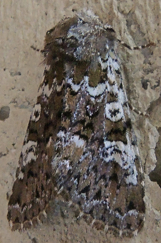 Eine weitere Bunte Waldgraseule ruht an einer Mauer. Informationen zum Tier: Art: Bunte Waldgraseule (Crypsedra gemmea). Verbreitung: In Europa weit verbreitet, stellenweise häufig. Regionale Verbreitung Alpen: Bis in Höhen von 2000 m. Lebensräume: Moorwaldungen, Moorwiesen, Mischwaldränder, Kiefernheiden, Lichtungen, Auen, Parklandschaften. Merkmale: Die Flügelspannweite beträgt 36 - 44 mm. Die Farbe der Vorderflügel variiert von olivbraun bis dunkelbraun. Der Costalrand ist abwechselnd schwarz und weiss gezeichnet. Im Wurzelfeld ist ein weissgelber Fleck erkennbar. Die jeweils weissen Ring-, Nieren- und Zapfenmakel treten deutlich hervor, sind schwarz umrandet und innen teilweise grau ausgefüllt. Die basale sowie die innere Querlinie sind weiss gefärbt mit trennscharfen, schwarzen Einfassungen. An der äusseren Wellenlinie befinden sich einige schwarze Pfeilflecke. Der Aussenrand ist wechselnd braun und weiss gepunktet. Die Hinterflügel sind einfarbig hell graubraun, der Saum dünn weisslich behaart. Ei: Das Ei ist tonnenförmig mit deutlichen Längsrippen, an der Basis gerundet mit flacher Oberseite. Es hat zunächst eine hellgelbe Färbung, die sich später über hellrot bis zu dunkelrot ändert. Die Überwinterung erfolgt im Eistadium. Raupe: Die Raupen sind glänzend bläulich- oder grünlichgrau gefärbt. Die Punktwarzen sind schwarz behaart. Kopf, Nacken- und Afterschild sind von braunschwarzer Farbe. Sie treten von April bis Juni auf und ernähren sich von verschiedenen Gräsern. Puppe: Die Puppe ist braun gefärbt. Die Verpuppung erfolgt dicht am Boden in röhrenförmigen Gängen, die aus abgebissenen Grasstücken gefertigt werden. Falter: Die Art bildet eine Generation pro Jahr. Sie fliegen von Juli bis Oktober, sind nachtaktiv und werden von künstlichen Lichtquellen angezogen. |