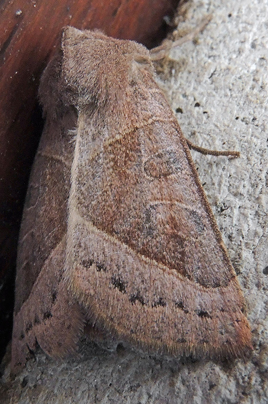 Eine Auenwald-Winkeleule sucht den Schutz des ebenfalls dunkel gefärbten Holzes. Informationen zum Tier: Art: Auenwald-Winkeleule (Mesogona oxalina). Verbreitung: Gemässigtes Europa, Kaukasus, Armenien. Regionale Verbreitung Alpen: Bis in Höhen von 2000 m. Lebensräume: Flusstäler, Auen, Gewässerränder. Merkmale: Die Falter weisen eine Flügelspannweite um 40 mm auf. Die Vorderflügel weisen eine gräulichbraune Färbung auf. Die Wellenlinie ist in schwarze Punkte aufgelöst. Die Hinterflügel sind gräulich. Ei: Das Ei ist silbrigweiss mit blauer Mittelzone. Es ist kugelig mit stark abgeflachter Basis und zahlreichen kräftigen Rippen. Das Eistadium dauert von September mit Überwinterung bis Februar. Raupe: Die Raupe ist hellbraun mit heller Rückenlinie und undeutlichen Nebenrückenlinien. Die Punktwarzen sind weiss. Die Seitenstreifen sind schwärzlich und unten gelblichweiss. Der Kopf ist braun. Der schwarze Halsschild weist 3 helle Linien auf. Die Raupe ist ab Februar bis Juni auf Laubhölzern wie Weiden, Erlen oder Pappeln zu finden. Puppe: Die Puppe ist gedrungen und weist einen kurzen, kammartigen Kremaster mit 4 Borsten auf. Das Puppenstadium liegt im Zeitraum Juni bis August. Falter: Die Falter fliegen ab August bis Anfang Oktober. |