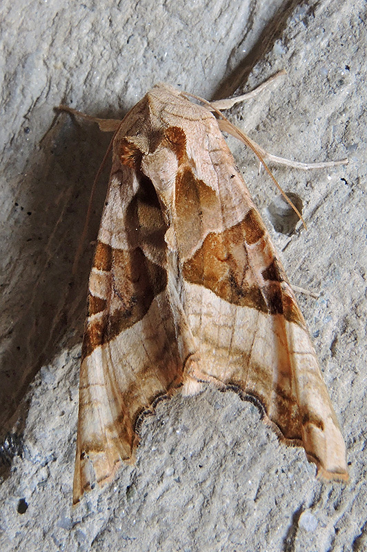 Charakteristisch ist die Flügelhaltung der Achateule während der Ruhephase. Die Flügel werden längs ein wenig gefaltet und sehen aus wie ein ausgetrocknetes, totes Blatt. Informationen zum Tier: Art: Achateule (Phlogophora meticulosa). |