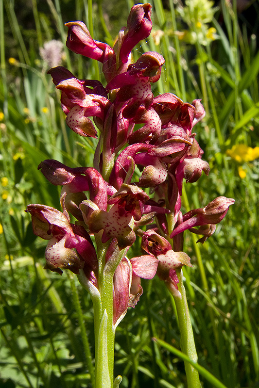 Am Wegrand stehen erste Exemplare des Wanzen-Knabenkrauts in Blüte. Informationen zur Pflanze: Art: Wanzen-Knabenkraut (Anacamptis coriophora). Verbreitung: Von Nordafrika über die iberische Halbinsel, die Balearen, Frankreich, Mitteleuropa, Süd- und Südosteuropa bis in Teile von Russland. Regionale Verbreitung Alpen: Bis in Höhen von 1800 m. Im Alpengebiet stark gefährdet, im nördlichen und südöstlichen Vorland vom Aussterben bedroht. Vorkommen: Warme, mineralreiche, nährstoffarme, zeitweilig feuchte Lehm-, Sandlehm und Moorböden - Halbtrockenrasen, leicht feuchte Wiesen, lichte Wälder, Gebüsche. Wuchshöhe: 10 - 40 cm. Blüte: Mai bis Mitte Juli, Länge Sepalen bis 10 mm, Länge Petalen bis 6 mm, Länge Lippe bis 10 mm, Blüten nach Blattwanzen riechend. |