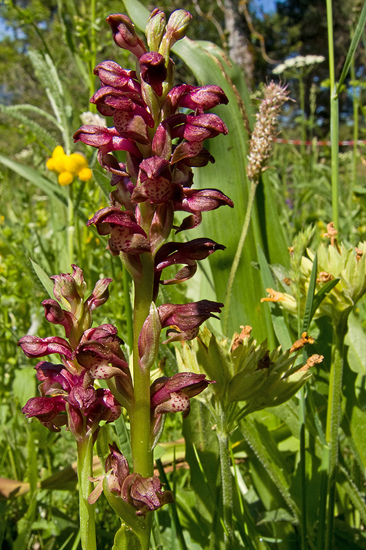 Einst im Mittelland und den Alpen weit verbreitet, findet sich in der Schweiz das Wanzen-Knabenkraut heute nur noch an wenigen Standorten im Wallis, Tessin und in Graubünden. Vor allem die intensivierte Landwirtschaft mit ihren unsäglichen Auswirkungen haben die Orchidee an den Rand des Aussterbens gebracht. Informationen zur Pflanze: Art: Wanzen-Knabenkraut (Anacamptis coriophora). Verbreitung: Von Nordafrika über die iberische Halbinsel, die Balearen, Frankreich, Mitteleuropa, Süd- und Südosteuropa bis in Teile von Russland. Regionale Verbreitung Alpen: Bis in Höhen von 1800 m. Im Alpengebiet stark gefährdet, im nördlichen und südöstlichen Vorland vom Aussterben bedroht. Vorkommen: Warme, mineralreiche, nährstoffarme, zeitweilig feuchte Lehm-, Sandlehm und Moorböden - Halbtrockenrasen, leicht feuchte Wiesen, lichte Wälder, Gebüsche. Wuchshöhe: 10 - 40 cm. Blüte: Mai bis Mitte Juli, Länge Sepalen bis 10 mm, Länge Petalen bis 6 mm, Länge Lippe bis 10 mm, Blüten nach Blattwanzen riechend. |