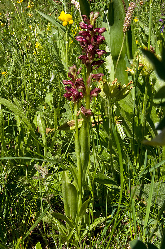 Das Wanzen-Knabenkraut ist eine sommergrüne, zierliche, aber kompakt und kräftig wirkende Pflanze. Am Grund des Stengels sind ein bis zwei bräunliche Schuppenblätter und zwei bis vier rosettenartige Grundblätter vorhanden. Im oberen Teil des Stengels befinden sich zwei bis drei weitere Laubblätter, die aber nicht bis zum Blütenstand reichen. Informationen zur Pflanze: Art: Wanzen-Knabenkraut (Anacamptis coriophora). Verbreitung: Von Nordafrika über die iberische Halbinsel, die Balearen, Frankreich, Mitteleuropa, Süd- und Südosteuropa bis in Teile von Russland. Regionale Verbreitung Alpen: Bis in Höhen von 1800 m. Im Alpengebiet stark gefährdet, im nördlichen und südöstlichen Vorland vom Aussterben bedroht. Vorkommen: Warme, mineralreiche, nährstoffarme, zeitweilig feuchte Lehm-, Sandlehm und Moorböden - Halbtrockenrasen, leicht feuchte Wiesen, lichte Wälder, Gebüsche. Wuchshöhe: 10 - 40 cm. Blüte: Mai bis Mitte Juli, Länge Sepalen bis 10 mm, Länge Petalen bis 6 mm, Länge Lippe bis 10 mm, Blüten nach Blattwanzen riechend. |