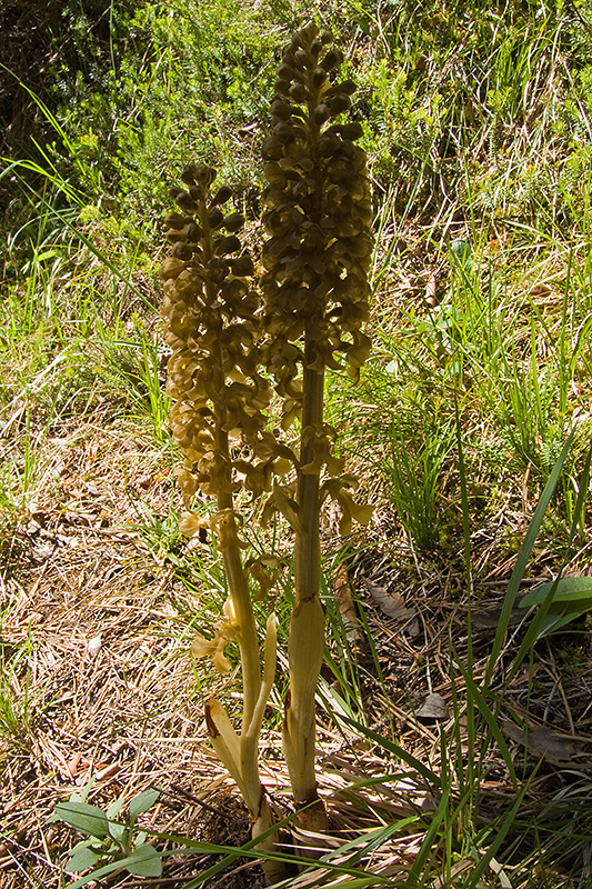 Ende Mai sind im Gegensatz zum letzten Jahr noch kaum irgendwelche Orchideen auszumachen. Die Vogel-Nestwurz ist eine der wenigen blühenden Arten. Informationen zur Pflanze: Art: Vogel-Nestwurz (Neottia nidus-avis). Verbreitung: Mit Ausnahme des nördlichsten Skandinaviens in ganz Europa, ostwärts weit nach Russland und bis in den Kaukasus. Regionale Verbreitung Alpen: In Höhen bis 1600 m, zerstreut. Vorkommen: Nicht zu trockene, kalkhaltige, nährstoffreiche, schattige Lehm- und Waldmullböden - Laub- und Laubmischwälder, seltener Nadelwälder. Wuchshöhe: 10 - 60 cm. Blüte: Mai - Juni. |