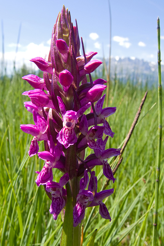 Die Fleischfarbene Fingerwurz findet sich über die gesamte Riedfläche verstreut. Informationen zur Pflanze: Art: Fleischfarbene Fingerwurz (Dactylorhiza incarnata). Verbreitung: Eurasiatisch. Regionale Verbreitung Alpen: In Höhen bis 1000 m, ganz selten bis 2000 m, zerstreut. Vorkommen: Mindestens zeitweise feuchte, kalkhaltige oder versauerte, tonige Böden - Flachmoore, nasse Wiesen, nasse und lichte Wälder. Wuchshöhe: 20 - 60 cm. Blüte: Mai - Juli. |