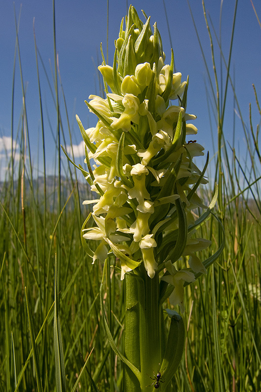 Im Gegensatz zur über das ganze Riet verstreut auffindbaren Fleischfarbenen Fingerwurz (Dactylorhiza incarnata) blühen beidseits des das Schwabbrünnerriet querenden Mittelweges lediglich knappe 20 Exemplare der Hellgelben Fingerwurz. Diese sehr seltene Orchidee scheint nasse Standorte zu bevorzugen. Informationen zur Pflanze: Art: Hellgelbe Fingerwurz (Dactylorhiza incarnata subsp. ochroleuca). Verbreitung: Europa von England bis zur Ukraine - Grossbritannien, Irland, Schweden, Frankreich, Deutschland, Schweiz, Österreich, Polen und Baltikum. Regionale Verbreitung Alpen: Bis in Höhen von 930 m, selten. Vorkommen: Basische, kalkhaltige Böden - nasse Streuwiesen, Hangquellmoore, Flachmoore. Wuchshöhe: 25 - 70 cm. Blüte: Anfang Juni bis Anfang Juli. |