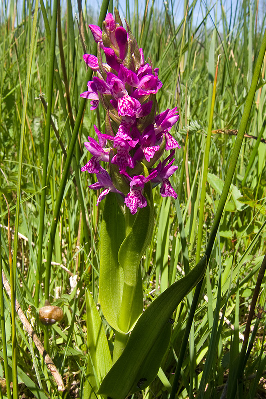 Gekielte bis gefaltene Laubblätter, die oberen mit nach innen gebogener Spitze sowie fleischfarbene, gelegentlich auch hellrosa Blüten kennzeichnen die Orchidee. Informationen zur Pflanze: Art: Fleischfarbene Fingerwurz (Dactylorhiza incarnata). Verbreitung: Eurasiatisch. Regionale Verbreitung Alpen: In Höhen bis 1000 m, ganz selten bis 2000 m, zerstreut. Vorkommen: Mindestens zeitweise feuchte, kalkhaltige oder versauerte, tonige Böden - Flachmoore, nasse Wiesen, nasse und lichte Wälder. Wuchshöhe: 20 - 60 cm. Blüte: Mai - Juli. |