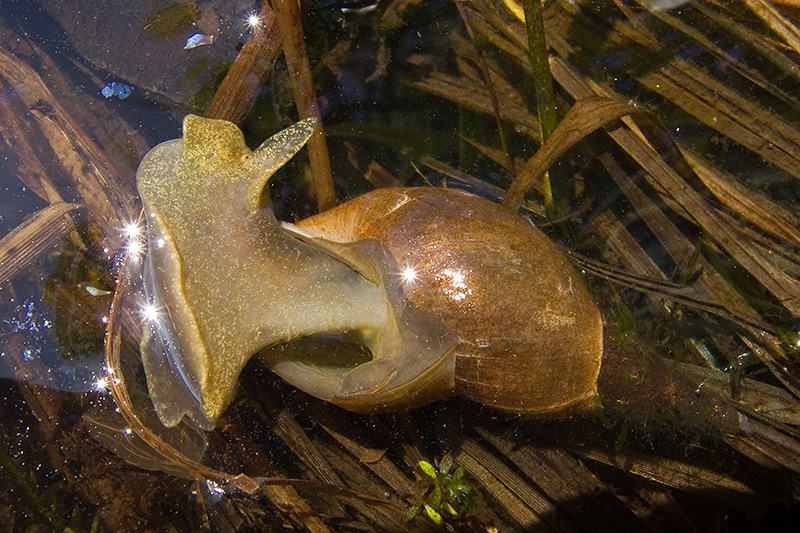 Gehäusehöhe bis 54 mm, Gehäusebreite bis 27 mm. Die Gehäusehöhe des abgebildeten Tieres beträgt 40 mm. Fundort: Weiher, im Wasser des Uferbereichs kriechend. |