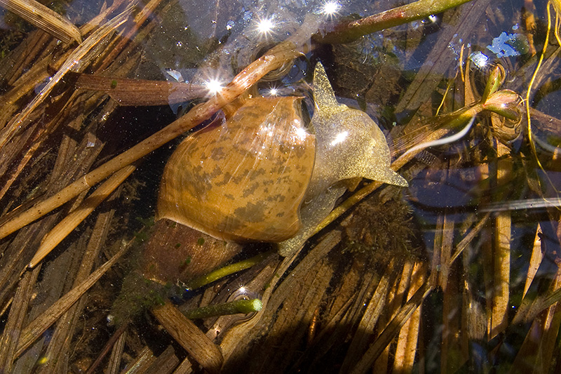 Wie bei allen Wasserschnecken kann das gut ausgebildete Fühlerpaar nicht eingezogen werden. Informationen zum Tier: Art: Spitzhornschnecke (Lymnaea stagnalis). |