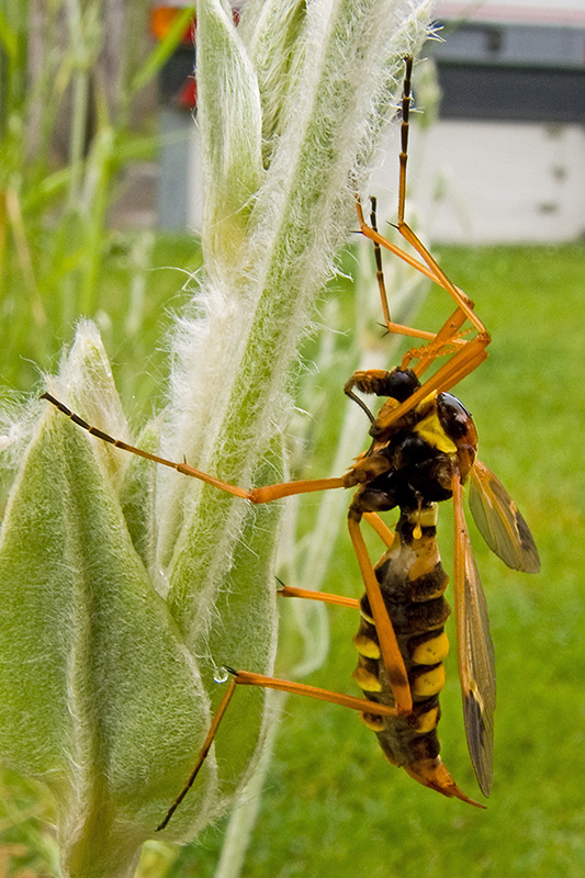 Seitlich gesehen zeigt es seine ungekämmten Fühler und den Legebohrer am Hinterleib. Informationen zum Tier: Art: Geschmückte Kammschnake (Ctenophora ornata). Verbreitung: Westliche Paläarktis, in Europa weit verbreitet, jedoch nirgends häufig. Lebensräume: Auwälder und Ufergebiete. Merkmale: Die Schnake wird 20 - 22 mm lang. Die Flügelspannweite liegt bei 30 - 40 mm. Thorax und Abdomen sind hellbraun bis dunkelrötlich, das 4. und das 5. Abdominalsegment sind matt gelb. Gelb ist auch der Halsring. Die Beine sind orangebraun. Am Ende der ansonsten durchsichtigen Vorderflügel befindet sich ein grosser dunkler Fleck. Die männlichen Tiere haben lange, gekämmte Fühler. Die Fühler der Weibchen sind ungekämmt und sehr kurz. Der Hinterleib des Weibchens ist zu einem auffälligen Legebohrer (Ovipositor) ausgebildet. Lebensweise: Die Schnake ist überwiegend dämmerungs- und nachtaktiv. Sie wird von künstlichen Lichtquellen angezogen. Nahrung: Das Imago ernährt sich von Nektar und Honigtau, die Larve von Laubbaummulm. Ei: Schattig gelegene Bäume mit grossem Umfang und in fortgeschrittenem Verfallsstadium werden zur Eiablage bevorzugt. Larve: Die Larven leben im Mulm alter Bäume (vor allem Buchen) und graben dort Gänge. Imago: Die Schnake ist von Juni bis August anzutreffen. |