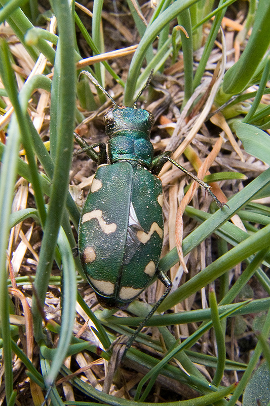 Ein Gallischer Sandlaufkäfer entweicht von sandigen Pfad ins angrenzende Grün, wo er zwischen den Grashalmen verharrt. Informationen zum Tier: Art: Gallischer Sandlaufkäfer (Cicindela gallica). Verbreitung: Gesamter Alpenraum. Regionale Verbreitung Alpen: In Höhen zwischen 1500 und 2800 m, mit Schwerpunkt in den Westalpen, in den Ostalpen nur stellenweise und selten. Lebensräume: Sonnige Stellen alpiner Matten und offener Erosionsflächen oberhalb der Waldgrenze bis unterhalb der Schneefelder. Merkmale: Die Käfer weisen eine Körperlänge von 11 - 15 mm auf. Die Deckflügel sind leuchtend grün gefärbt und haben weisse Zackenbinden. Selten sind sie dunkler, bläulich oder schwach kupfrig überflogen. Der Apikalmakel an der Spitze der Deckflügel besteht in der Regel aus zwei einzelnen Flecken. Das erste Fühlerglied ist komplett weiss behaart. Die Labialpalpen sind komplett metallisch dunkel gefärbt. Die Stirn weist keine Behaarung auf. Lebensweise: Die gut entwickelten, grossen Augen und die langen, schlanken Beine weisen die tagaktiven Tiere als Jäger aus. Nahrung: Larve wie Imago leben räuberisch, sie fressen kleinere Insekten und Spinnen. Paarung: Zur Paarung liegen keine Erkenntnisse vor. Ei: Zum Eistadium liegen keine Erkenntnisse vor. Larve: Die Larve entwickelt sich in selbstgegrabenen, senkrechten Erdröhren und wartet dort auf vorbeilaufende Beutetiere. Sie überwintert. Puppe: Zum Puppenstadium liegen keine Erkenntnisse vor. Käfer: Die Art ist gut an Kälte angepasst und kann deswegen an sonnigen Hängen noch Ende Oktober und nach der Überwinterung schon Anfang Juni angetroffen werden. Feinde: Frösche, Kröten, Spitzmäuse, Igel, Fledermäuse, Nagetiere, Singvögel, Spechte, aber auch Parasiten und Parasitoide. |