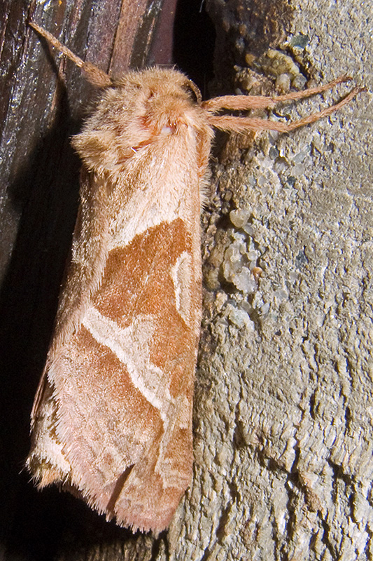 Ein Männchen des Ampfer-Wurzelbohrers sitzt vom Licht angelockt an einer Hauswand. Informationen zum Tier: Art: Ampfer-Wurzelbohrer (Triodia sylvina). Verbreitung: Mittel- und Südeuropa. Regionale Verbreitung Alpen: Bis in Höhen von 2000 m. Lebensräume: Offenland, auch intensiv genutzte Siedlungsräume, Wiesen, Gärten, Parklandschaften, Waldränder, Wald. Merkmale: Die Spannweite beträgt beim Männchen 23 - 39 mm, beim Weibchen 27 - 50 mm. Die Flügel haben eine längliche und schmale Form. Die Weibchen sind grau und dunkelbraun gefärbt und besitzen eine weisse linienartige Zeichnung. Die Männchen sind orangebraun gefärbt, die Vorderflügel sind mit einem hellen Saum umrandet. Sie sind ausserdem oft erheblich kleiner als die Weibchen. Ei: Das Ei ist rundlich, dunkel und seitlich etwas eingedrückt. Raupe: Die Raupe ist glänzend beinweiss, mit rotbraunem, grossem, gerundetem Kopf und Rückenschild. Die Mundteile sind schwarz, die Stigmen braun. Sie lebt in den Wurzeln verschiedener Pflanzenarten, an denen sie frisst. Sie bevorzugt die Wurzeln von Ampfer (Rumex), Wegerich (Plantago) und Malven (Malva). Im Gartenbau ist sie ein bekannter Frassschädling am Kopfsalat (Lactuca sativa). Die Entwicklung ist zweijährig, die Raupe überwintert. Puppe: Die Raupe verpuppt sich in der Erde in einem leichten Gespinst. Die Puppe ist glänzend gelbbraun und mit Stacheln besetzt. Falter: Der Falter schlüpft Ende Juli. Er fliegt dann bis September, meist nur kurze Zeit in der Abenddämmerung. |