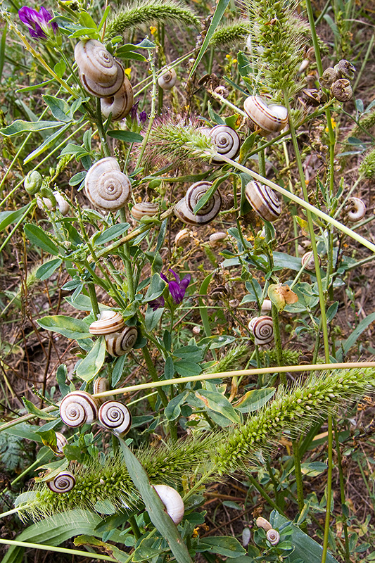 Massenweise Weisse Heideschnecken halten entlang des Rhônedammes Trockenruhe. Informationen zum Tier: Art: Weisse Heideschnecke (Xerolenta obvia). Anmerkung: Es existieren einige sehr ähnliche Arten. Auf Grundlage von Fotos ist Xerolenta obvia nur schwierig von Helicella itala oder von Cernuella neglecta zu unterscheiden. |