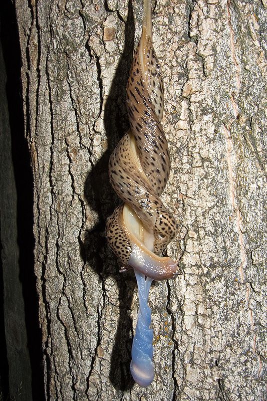 Schnegel (Limacidae) zeigen ein faszinierendes, arttypisches Paarungsverhalten. Der Grosse Schnegel (Limax maximus) gehört zu jenen Arten, die sich an einem Schleimfaden hängend fortpflanzen. Die einzelnen Paarungsschritte verlaufen beim Grossen Schnegel vergleichsweise gemächlich ab und sind entsprechend gut zu fotografieren. Die Bilder dieser Paarung wurden in freier Natur aufgenommen. Nach einer länger andauernden Hitzeperiode ist die Luft beim Eintreffen einer abgeschwächten, abendlichen Kaltfront angefeuchtet, es fällt aber wie im zentralen Wallis gerne üblich kein Regen. Auf der Ausschau nach herumkriechenden Schnecken stolpere ich gegen 23.00 Uhr am Fusse einer Pappel über zwei wohl bei einem Paarungsversuch abgestürzte Grosse Schnegel. Den Stamm selbst angeleuchtet, befinden sich gerade zwei weitere Tiere am Ende des Vorspiels. Die anschliessende, eine Dreiviertelstunde dauernde Paarung kann ich mit dem Fotoapparat festhalten. Auch in der näheren Umgebung verleitet die Feuchte dieser Nacht weitere Grosse Schnegel zu Paarungen. |