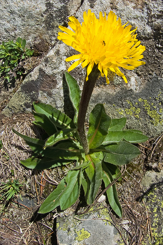 Eine einzelne Blüte des Einköpfigen Ferkelkrauts leuchtet im Blockwerk des Gipfels. Informationen zur Pflanze: Art: Einköpfiges Ferkelkraut (Hypochoeris uniflora). Verbreitung: Mitteleuropa. Regionale Verbreitung Alpen: In Höhen zwischen 1000 und 2500 m. In Ketten mit kristallinem Gestein, zerstreut. Im Kalkgestein Anzeiger von oberflächlicher Versauerung. Vorkommen: Kalkarme, saure Lehmböden - Matten, Gebüsch, Waldränder. Wuchshöhe: 30 - 50 cm. Blüte: Juni - August, Körbchen 5 - 7 cm Durchmesser. |