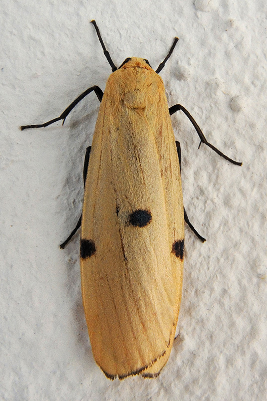 Das Weibchen des Vierpunkt-Flechtenbärs hat gelbe, mit blauschwarzen Punkten versehene Flügel. Informationen zum Tier: Art: Vierpunkt-Flechtenbär (Lithosia quadra). |