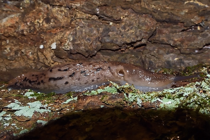 Die bisher durch mich im Gebiet aufgefundenen Sarner Schnegel (Limax sarnensis) sind einfarbig und weisen keinerlei Zeichnung auf. Nicht so dieses Exemplar, dessen blassbräunlicher Rücken mit einer schwarzen Fleckenzeichnung überzogen ist. Abweichungen weist auch der Schild auf, dessen Rand wie mir sonst vom Schwarzen Schnegel (Limax cinereoniger) her bekannt aufgehellt ist. Blasse Stellen finden sich zudem über das ganze Schild verteilt. Informationen zum Tier: Art: Sarner Schnegel (Limax sarnensis). |