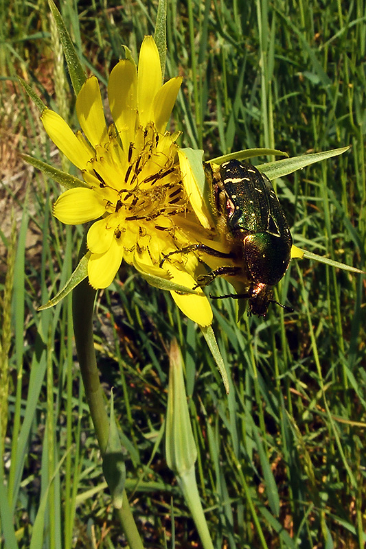 Ein Goldglänzender Rosenkäfer krabbelt auf einer Blüte des Grossen Bocksbarts (Tragopogon dubius) umher. Informationen zum Tier: Art: Goldglänzender Rosenkäfer (Cetonia aurata). |