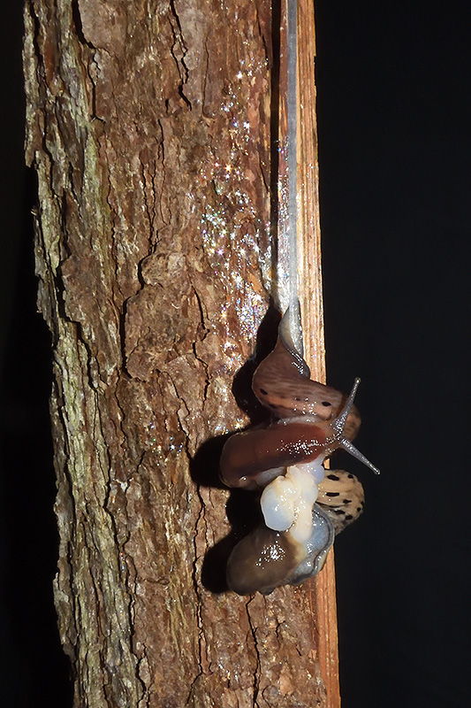 Paarungsablauf Limax sarnensis Die endgültige Länge des Schleimfadens variiert gemäss Literaturangaben zwischen 14 und 70 cm. Bei dieser Paarung weist der Schleimfaden eine Länge von 36 cm auf. Informationen zum Tier: Art: Sarner Schnegel (Limax sarnensis). |