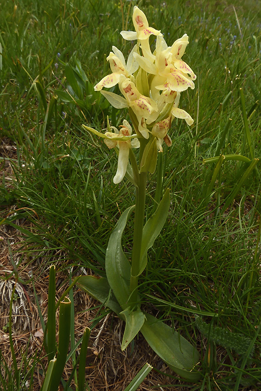 In den Bergwiesen blüht vereinzelt die Holunder-Fingerwurz.