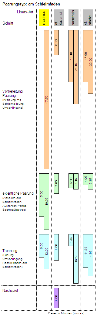 Schnegel (Limacidae) zeigen ein faszinierendes, arttypisches Paarungsverhalten. Der Grosse Schnegel (Limax maximus) gehört zu jenen Arten, die sich an einem Schleimfaden hängend fortpflanzen. Die einzelnen Paarungsschritte verlaufen beim Grossen Schnegel vergleichsweise gemächlich ab und sind entsprechend gut zu fotografieren. Diese Paarung ist in Terrarienhaltung aufgenommen. Einmal davon abgesehen, dass es 'ewig' zu dauern scheint, bis sich die Tiere wirklich zur Paarung entschliessen können, verläuft diese anfänglich ganz normal. Am Schleimfaden hängend, wird sie dann aber rasch verzwickter. Der Grund ist das stetige Lockern der Umwindung bis fast zur Auflösung hin, wodurch die eine Schnecke laufend tiefer zu hängen kommt als ihr Partner. Irgendwie schaffen es die beiden Tiere aber dennoch, die Paarung erfolgreich zu Ende zu bringen. |