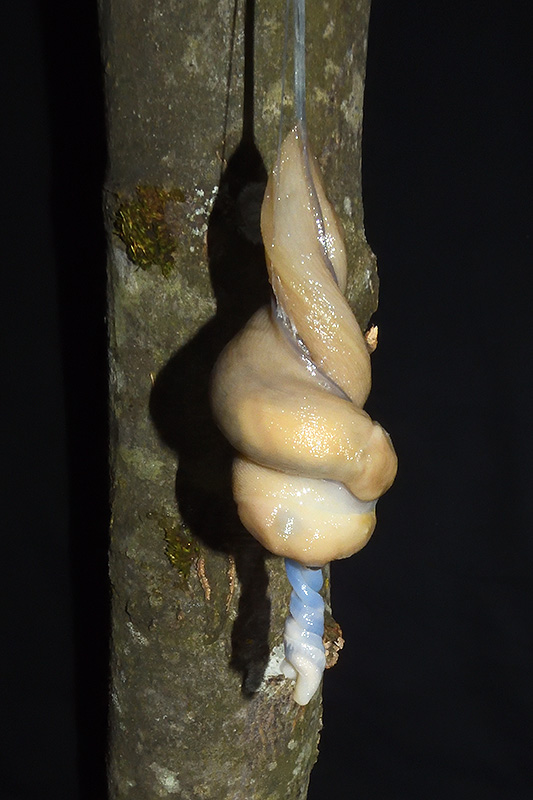 Paarungsablauf Limax cf. strobeli Die endgültige Länge des Schleimfadens variiert von etwa 30 cm bis zu gemäss Literaturangaben 100 cm. Bei dieser Paarung weist der Schleimfaden eine Länge von 31 cm auf. Informationen zum Tier: Art: Blauköpfiger Schnegel (Limax cf. strobeli). |