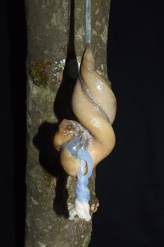 Paarungsablauf Limax cf. strobeli Die endgültige Länge des Schleimfadens variiert von etwa 30 cm bis zu gemäss Literaturangaben 100 cm. Bei dieser Paarung weist der Schleimfaden eine Länge von 31 cm auf. Informationen zum Tier: Art: Blauköpfiger Schnegel (Limax cf. strobeli). |