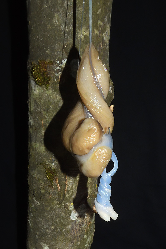 Paarungsablauf Limax cf. strobeli Die endgültige Länge des Schleimfadens variiert von etwa 30 cm bis zu gemäss Literaturangaben 100 cm. Bei dieser Paarung weist der Schleimfaden eine Länge von 31 cm auf. Informationen zum Tier: Art: Blauköpfiger Schnegel (Limax cf. strobeli). |