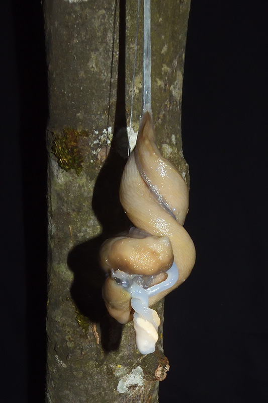 Paarungsablauf Limax cf. strobeli Die endgültige Länge des Schleimfadens variiert von etwa 30 cm bis zu gemäss Literaturangaben 100 cm. Bei dieser Paarung weist der Schleimfaden eine Länge von 31 cm auf. Informationen zum Tier: Art: Blauköpfiger Schnegel (Limax cf. strobeli). |