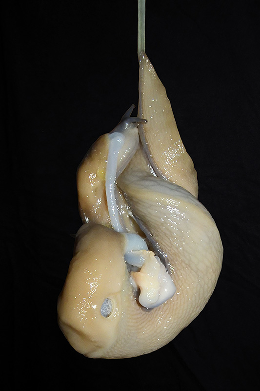 Paarungsablauf Limax cf. strobeli Die endgültige Länge des Schleimfadens variiert von etwa 30 cm bis zu gemäss Literaturangaben 100 cm. Bei dieser Paarung weist der Schleimfaden eine Länge von 62 cm auf. Informationen zum Tier: Art: Blauköpfiger Schnegel (Limax cf. strobeli). |